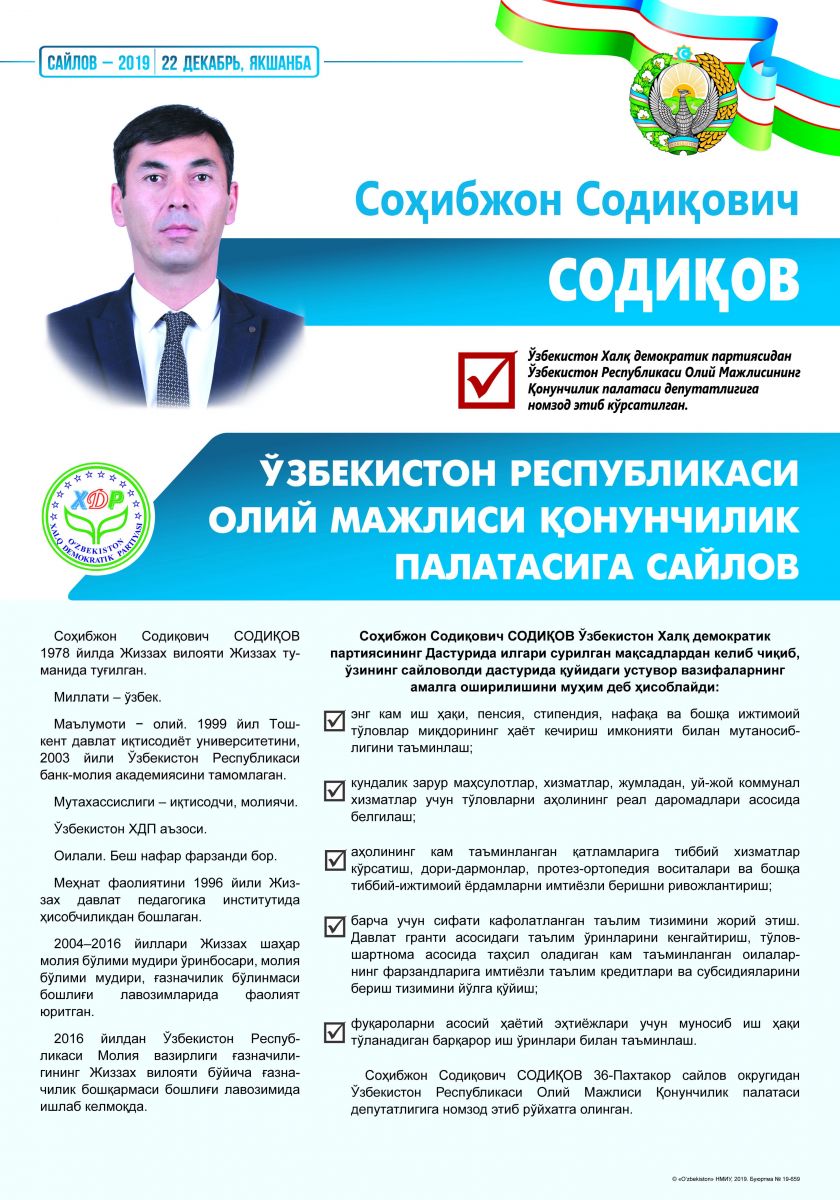 Ўзбекистон “Миллий тикланиш” демократик партияси Марказий кенгашининг раиси , Ўзбекистон Республикаси Олий Мажлиси Қонунчилик палатаси депутати, Спикерининг ўринбосари