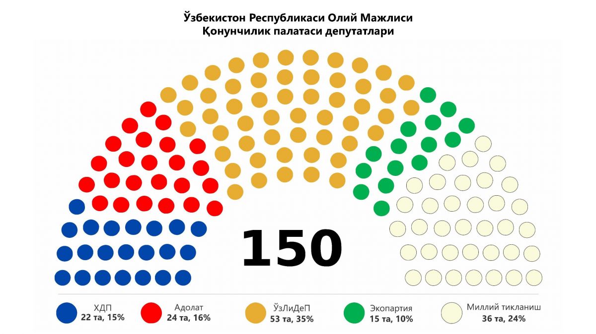 Дастлабки ҳамда такрорий овоз бериш натижасида, яъни сайловларнинг умумий якунларига кўра, Ўзбекистон Республикаси Олий Мажлиси Қонунчилик палатасида сиёсий партиялар қуйидагича депутатлик ўринларига эга бўлдилар: