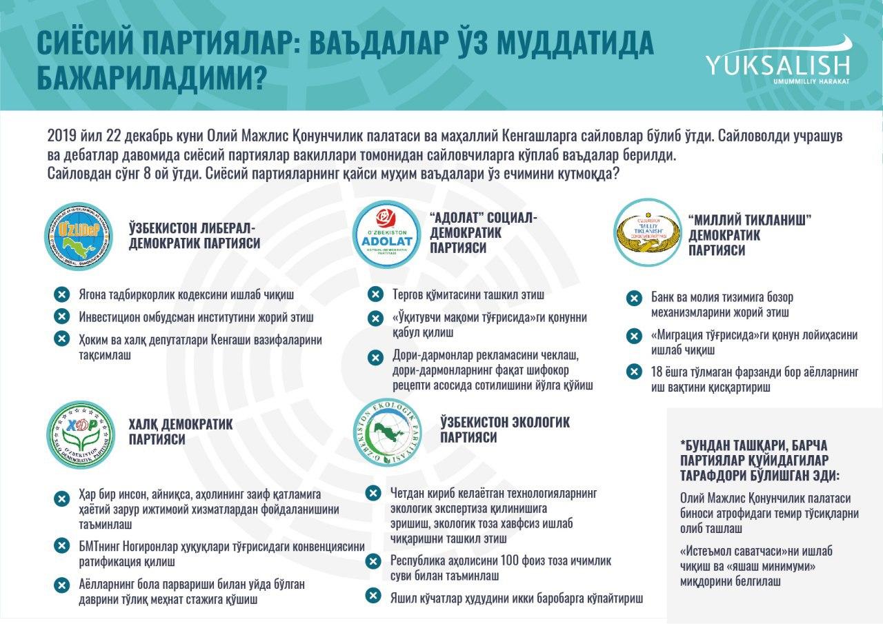 Шу билан бирга, сиёсий партиялар томонидан ваъда қилинган яна қатор муҳим вазифалар ҳали ҳам ўз ечимини кутмоқда. Уларнинг айримлари бизнинг навбатдаги #инфографикамиздан жой олган.