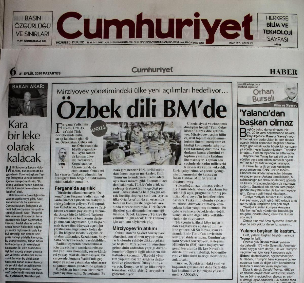«БМТда илк бор Навоий тилида» — Туркиянинг «Жумҳурият» газетаси Мирзиёевнинг БМТда ўзбек тилида нутқ сўзлашини олқишлади