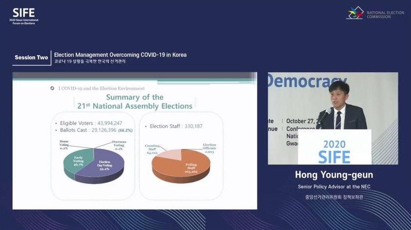 “COVID-19 билан курашиш жараёнида сайловларни бошқариш бўйича Корея тақдимоти” мавзусига бағишланган иккинчи сессияда 2020 йил апрель ойида Корея Республикасининг 21-чақириқ Миллий мажлисига ўтказилган сайловларга тўхталиб ўтилди. Ушбу сайловлар ЖССТ томонидан COVID-19 пандемияси эълон қилингандан сўнг ўтказилган биринчи умуммиллий сайловлар сифатида қайд этилган эди. Мазкур сайловдан орттирилган тажрибаларни пандемия шароитида сайлов ўтказадиган бошқа давлатлар намуна сифатида фойдаланишлари мумкинлиги айтиб ўтилди.