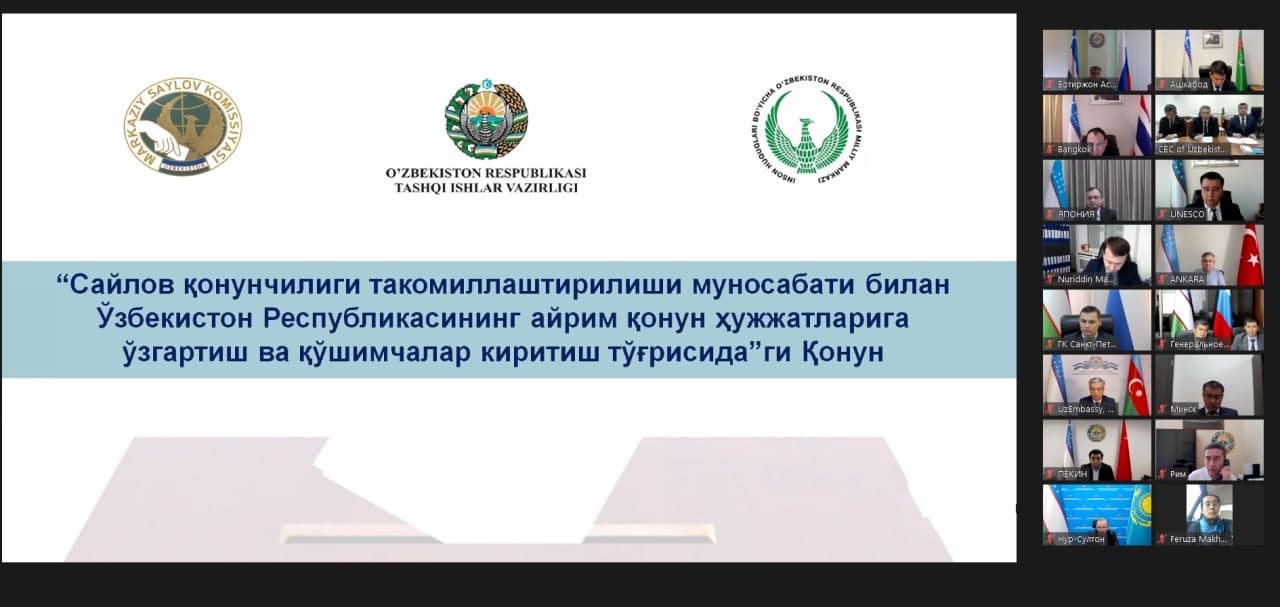 2021 йил 23 февралда Ўзбекистон Республикасининг хориждаги дипломатик ва консуллик ваколатхоналари раҳбарлари ва ходимлари учун 2021 йил 8 февралда қабул қилинган “Сайлов қонунчилиги такомиллаштирилиши муносабати билан Ўзбекистон Республикасининг айрим қонун ҳужжатларига ўзгартиш ва қўшимчалар киритиш тўғрисида”ги Қонуннинг мазмун-моҳияти ва аҳамиятига бағишланган видеоконференцалоқа шаклида семинар ўтказилди.