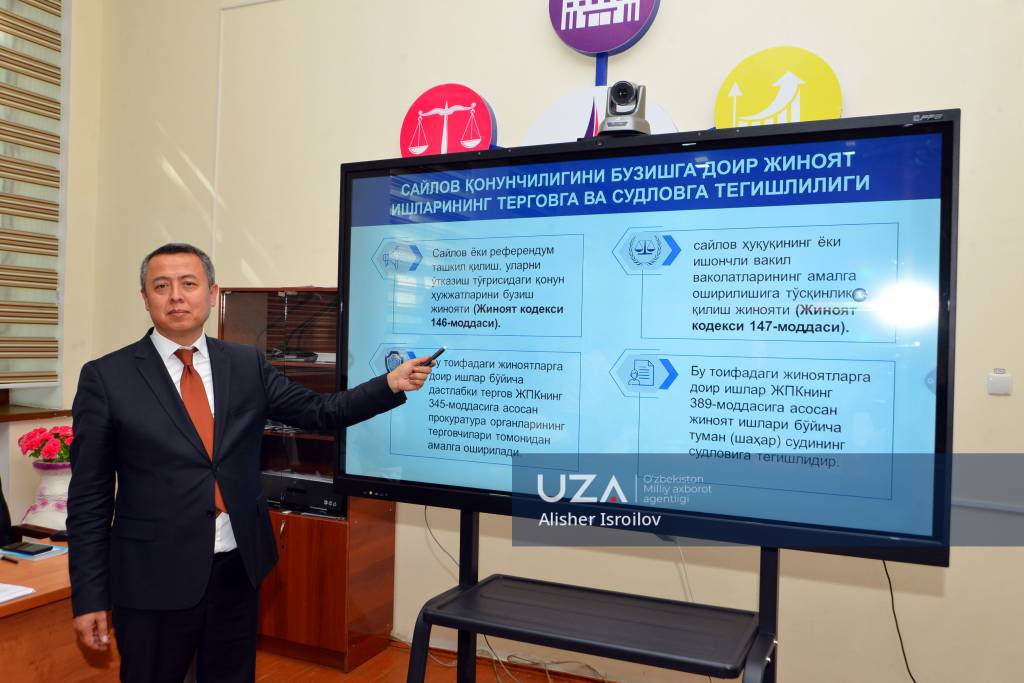 – Дастлабки босқичда пойтахтимизда ўқувлар ташкил этилиб, республика тренерларнинг билим ва малакаси оширилди, – дейди Тошкент давлат юридик университети профессори вазифасини бажарувчи Олим Нарзуллаев. – Улар зарур қўлланма ва тарқатма материаллар билан таъминланди. Энди эса иккинчи босқичда ҳудудий тренерлар ва сайлов жараёни иштирокчиларининг малакаси оширилмоқда. Машғулотлар интерактив усулда ташкил этилиб, иштирокчилар билан мулоқот, ўзаро фикр ва тажриба алмашиш тарзида ўтказилмоқда. Ҳар бир мавзу бўйича савол-жавоблар, тест синовлари ўтказилиб, билимлар мустаҳкамланмоқда. Шунингдек, ҳар бир мавзуси бўйича тайёрланган 15-20 дақиқалик видеодарслар ўқув жараёнида фойдаланиш учун ҳудудий тренерларга тақдим этилмоқда. Улар кейинги босқичда туман, шаҳарларда шундай семинарларда сайлов жараёни иштирокичиларини ўқитадилар, уларга ўз тажрибаларини ўргатадилар.