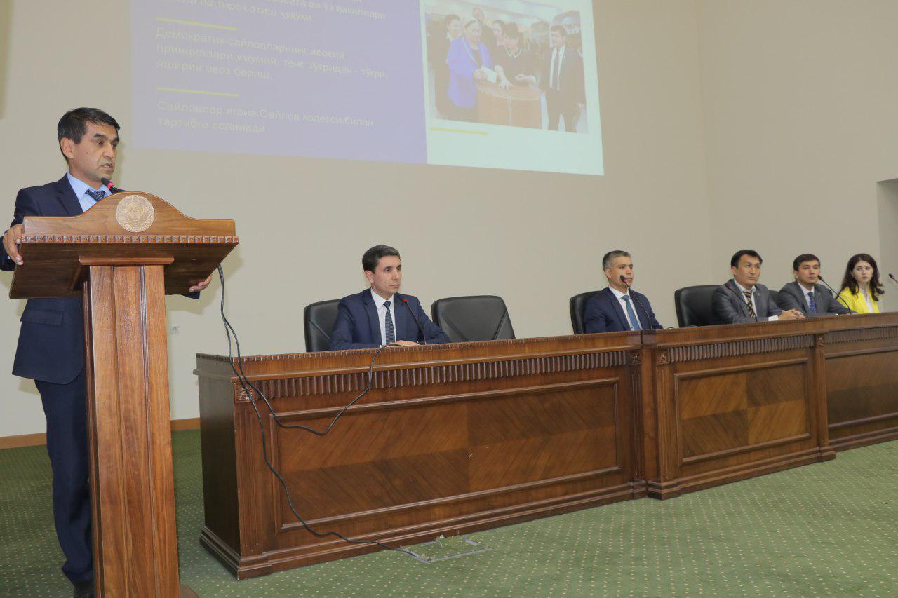 Шунингдек, Марказий сайлов комиссияси Ўқув маркази директори, ю.ф.д, профессор Ш.Файзиев ўз нутқида Сайлов кодексидаги янгиликлар, сайловчиларнинг ягона электрон рўйхатини шакллантириш тартиби, Округ ва участка сайлов комиссияларини тузиш билан боғлиқ чора-тадбирлар, шу жумладан, хорижий давлатлардаги дипломатик ваколатхоналарда ҳам участка сайлов комиссиялари ташкил этилганлиги, номзодларнинг сайловолди ташвиқотини олиб бориш муддати ва шакллари ҳақида батафсил маълумот берди.