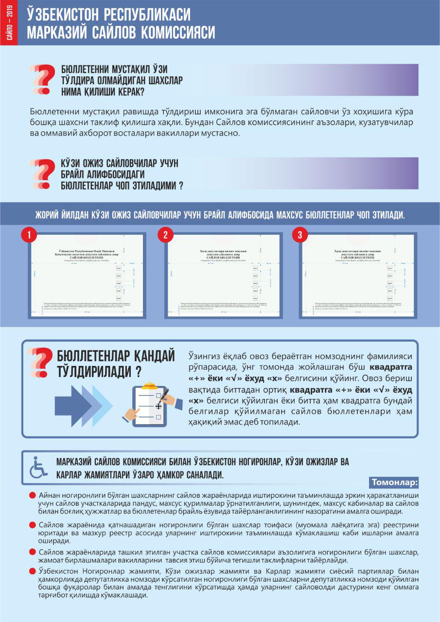 iii) ногиронларнинг сайловчилар сифатида ўз иродаларини эркин билдиришларини кафолатлаш ва шу мақсадда, зарурат бўлганда, уларнинг ўз танлови бўйича бирорта шахс томонидан овоз беришда ёрдам кўрсатиш тўғрисидаги илтимосларини қондириш;